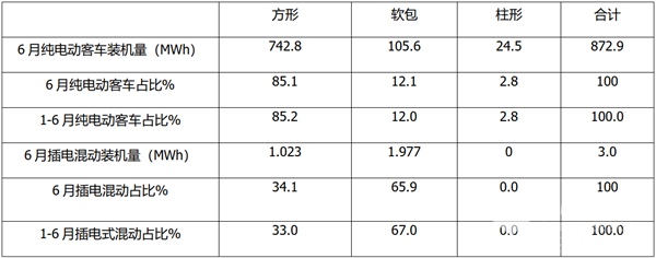 插电式混动客车中,不论6月还是1-6月,软包型电池装机量都最大,占比达到67%左右,其次是方形占比33%左右,柱形为零。