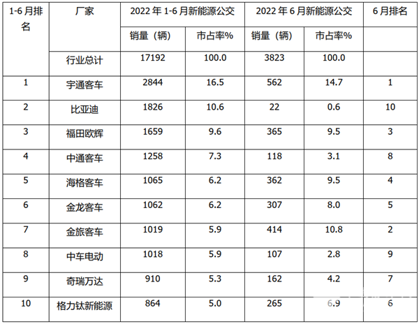 2022年6月及上半年新能源公交客车市场特点简析