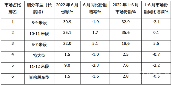上表可见,在2022年6月及1-6月新能源公交客车各长度段(细分车型)销量占比中,呈现以下特点:
