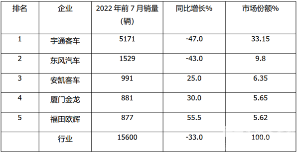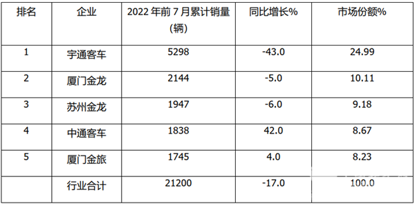 根据中汽协数据,2022年前7月中型客车销量排行: