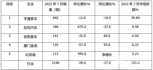 根据中汽协数据,2022年7月中型客车销量排行: