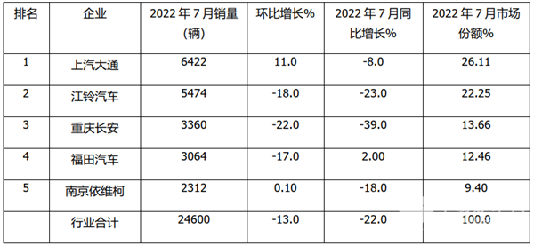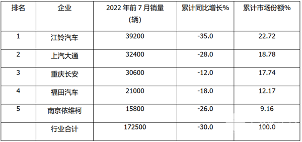根据中汽协数据,2022年前7月TOP5企业轻型客车销量、同比及份额统计: