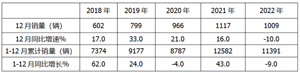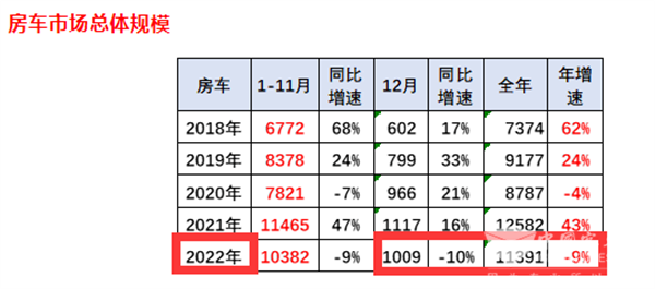 根据中国汽车流通协会数据,2022年12月及1-12月房车销量及同比统计: