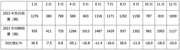 上表可见,在近5年的12月的房车销量中,2022年12月的销量为1009辆,是近年同期第二高的月份,处于中上水平,同比增长-10%,增幅居近年同期最低。