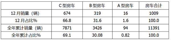 ---12月及全年C型房车销量占比均在7成左右(分别为66.8%和69.1%),占据了12月和全年房车市场的主体地位;