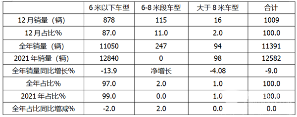 表4,根据终端上牌数据,按长度段划分,2022年12月及全年房车市场销量结构统计: