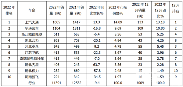 2022年全年,上汽大通夺得房车行业冠军,累计销量为1605辆,同比增长13.3%,市场占比14.09%;居于第一;宇通客车累计销售1104辆,同比下降15.8%,居第二;排名第3名及以后企业销量均在1000辆以下;top10同比3增7降,其中湖北齐心同比增长63.7%领涨TOP10;