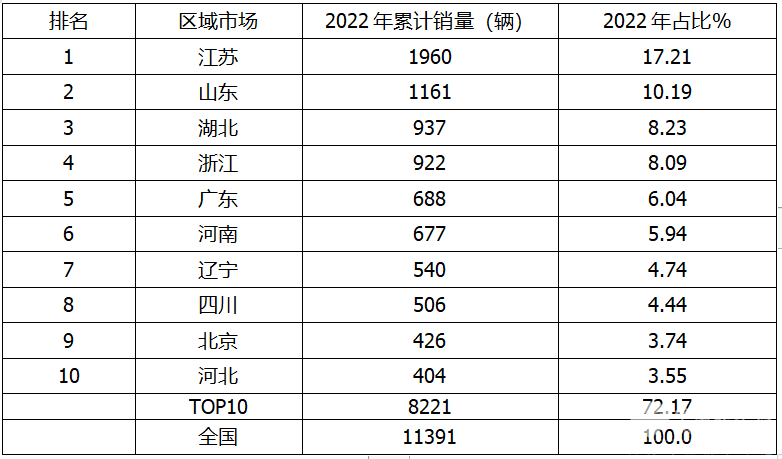 表6,根据终端上牌数据,2022年房车区域市场销量中,江苏、山东、湖北居前三。累计销量在500辆以上的有8个省。现将2022年房车销量top10区域统计如下: