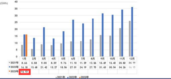 截图2,2022年1月—2023年1月新能源汽车动力电池装机量(数据来源:中国汽车动力电池产业创新联盟)