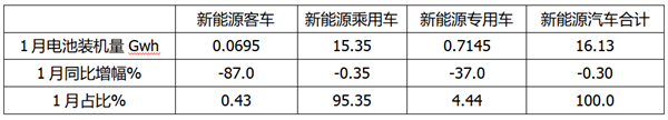 特点二:1月我国新能客车动力电池装机量在新能源汽车各细分市场中同比增幅最小,是新能源汽车中同比下降幅度最大的细分市场;占比也最小