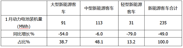 ---中型新能源客车动力电池装机量为113 MWh,同比下降6%,同比降幅是新能源客车市场中最小的,市场占比为48.1%,居榜首;