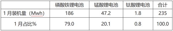 表5,根据GII终端数据,2023年1月各类电池装机量及占比统计: