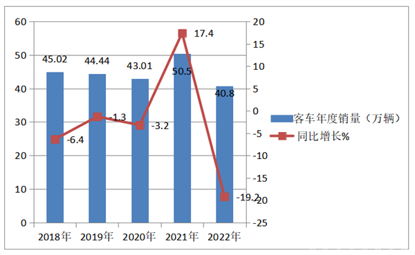 根据中汽协数据,2022年客车行业以累计销售40.78万辆,同比下降19%的业绩收官,销量及同比均创下近5年行业新低(见下图,数据来源中汽协),这主要是由2022年恶劣的市场环境导致的。