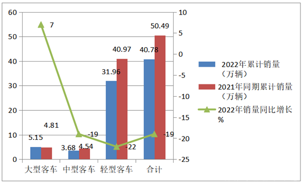 从2022年大中轻客车各细分市场的表现来看,大型客车累计销售5.15万辆,同比增长7%,是客车市场中同比唯一正增长的细分车型,表现最好;中型客车累计销售3.68万辆,同比下降19%;轻型客车累计销售31.96万辆,同比下降22%,是客车市场中同比降幅最大的细分车型(见下图,数据来源:中汽协)。