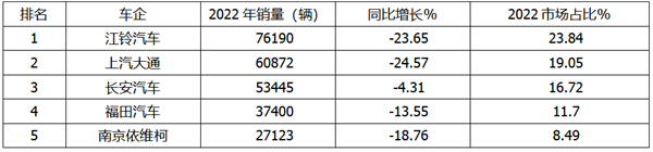 从2022年的车企表现看,与往年一样,宇通仍牢牢的占据了大中型客车市场的霸主地位,“两通三龙”仍排在大中型客车行业的前5名(见表1,数据来源:客车统计信息网);江铃汽车则仍领跑轻型客车市场,并与上汽大通、长安汽车、福田汽车和南京依维柯构成了轻客行业的TOP5(见表2,数据来源:中汽协)。