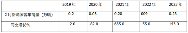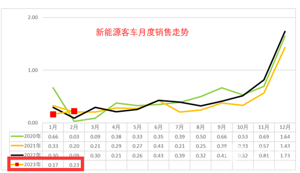 ---2023年2月新能源客车终端上牌销量为0.23万辆,在近5年同期中处于第一;