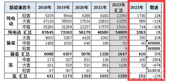 表2,根据截图3数据,按技术路线划分,2023年1-2月各类新能源客车销量同比、占比: