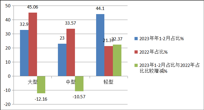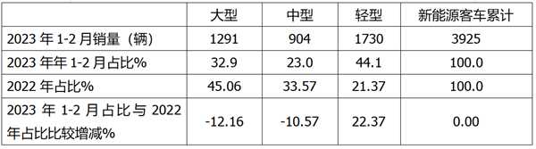 表3,根据截图3数据,按大中轻划分,2023年1-2月各类新能源客车销量同比、占比:
