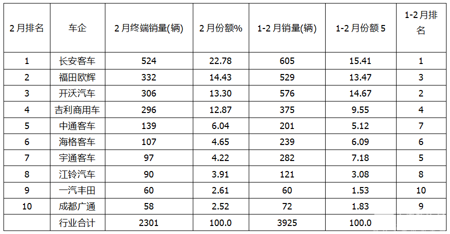 ---长安客车累计销量605辆,也是唯一单月销量超600辆的车企,累计占比15.41%,居第一;
