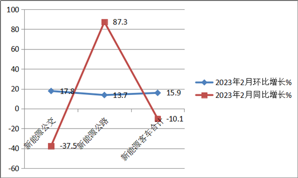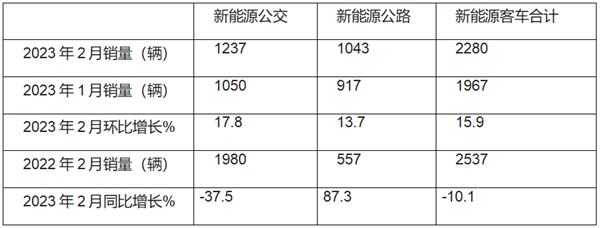 上图表显示,2023年2月新能源公交客车销售1237辆,环比增长17.8%,领涨今年2月新能源客车市场;2023年2月新能源公交客车销量同比下降37.5%,领跌今年2月新能源客车市场。