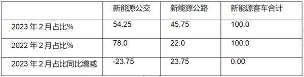 上表可见,2023年2月新能源公交客车占比54.25%,占比同比减少23.75个百分点,说明新能源公交客车之前的主体地位同比明显减弱,而新能源公路客车的次要地位同比明显增强。
