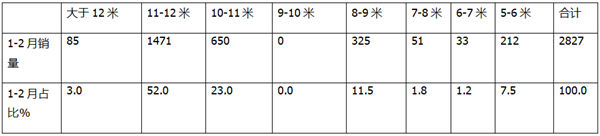 上表显示,在2023年1-2月按长度段划分的公交客车各个细分车型销量中: