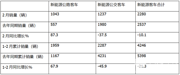 据分析主要是去年同期的新能源公路客车销量基数较低,加之今年1月新能源汽车购置补贴的取消对新能源公交客车影响大,而对今年2月及1-2月新能源公路客车的影响较小。