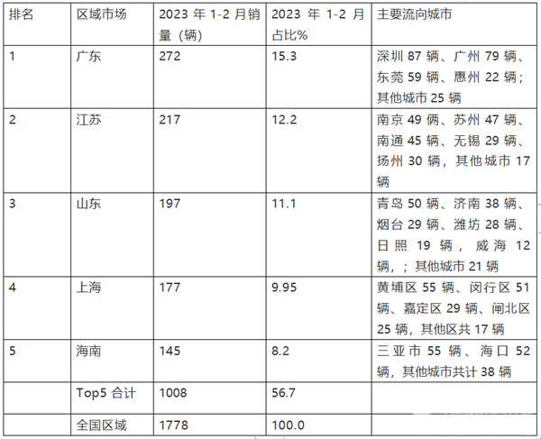 根据终端上牌信息,2023年1-2月5米以上新能源公路客车累计销售1778辆,从各地上牌信息看,广东、江苏、山东居前三。