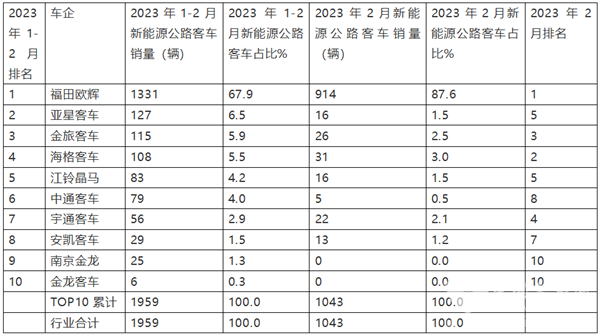 ---TOP10累计销售1959辆,累计占比100%,说明2023年1-2月新能源公路客车只有10家车企参与销售,其余企业均未销售新能源客车,说明今年1-2月新能源公路客车市场集中度很高。