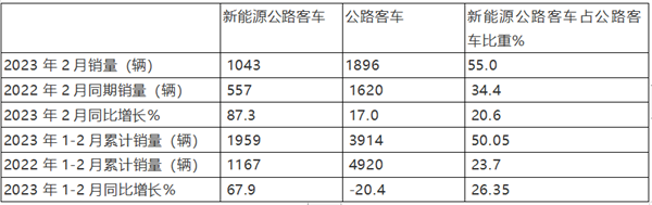2023年1-2月新能源公路客车累计销售1959辆,同比(去年1-2月累计销售新能源公路客车1167辆)增长67.9%;也跑赢今年1-2月新能源客车-21.3%的增幅。