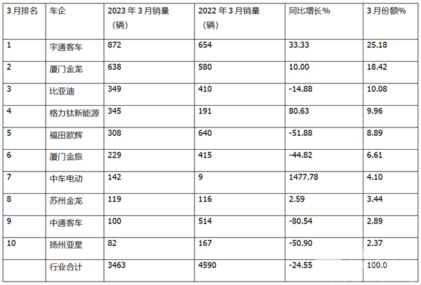 表2,根据中国客车统计信息数据,2023年1-3月公交客车销量top10同比、市场份额: