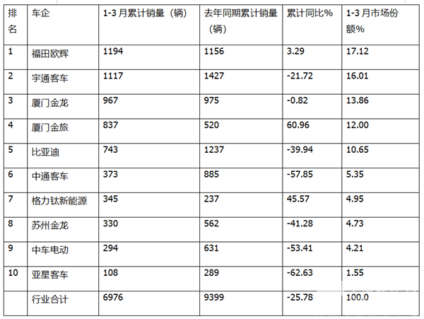 ---1-3月公交市场累计销售6976辆,同比下滑25.78%。