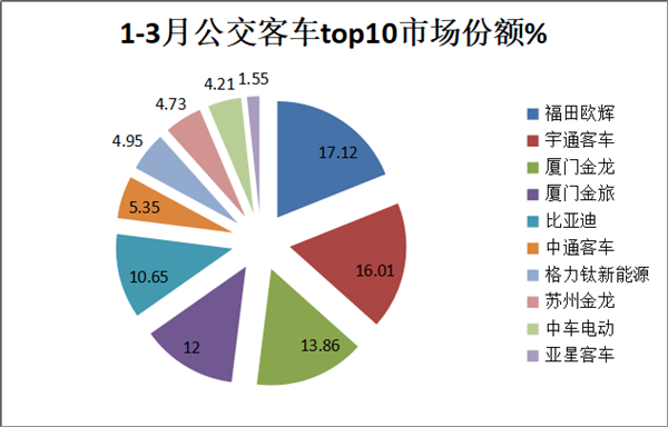 上图表显示,2023年1-3月公交客车销量top10排行: