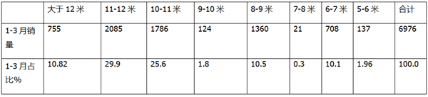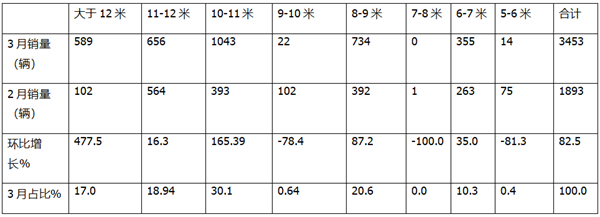 从公交客车各长度段看,今年3月10-11米最畅销,1-3月11-12米段占比最高。