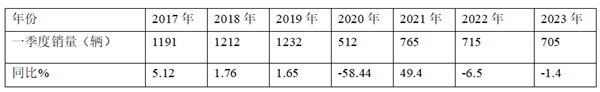 上表可见,2023年一季度高档客车累计销售705辆,同比增长下滑1.4%,,销量也处于近7年同期中第二低(第一低是2020年一季度),应该说今年一季度高档客车的销量在近年处于较低水平,说明今年的一季度的高档客车市场仍然处于相对低迷的状态。主要原因是: