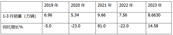 上表可见,2023年1-3月轻客累计销售8.663万辆,居近5年同期第二高;同比增长14.58%,增幅是近5年同期中第二大。可见今年1-3月轻客市场居近5年同期中上水平。