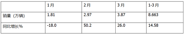 3月销量4.0161万辆,创今年一季度各月销量新高;同比增长41.83%,居今年一季度各月第二。主要原因上文已简析。