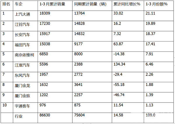 ---上汽大通累计销售18309辆,居轻客行业的冠军,同比增长69.92%,跑赢1-3月轻客大盘;市场份额为21.11%;