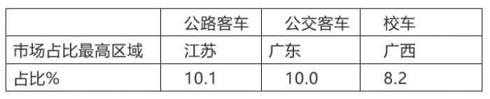 表5,根据上牌信息,2023年1-12月5米以上客车三大细分市场市场份额最高区域及占比统计: