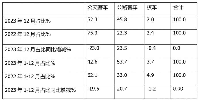 总之,无论是2023年12月还是1-12月,公路客车占比同比均增加最多,是表现最好的细分市场。据分析主要是由于新能源汽车购置补贴取消影响了新能源公交客车市场加之旅游客运市场回暖导致,反而让公路客车市场占了“天时”和“地利”。