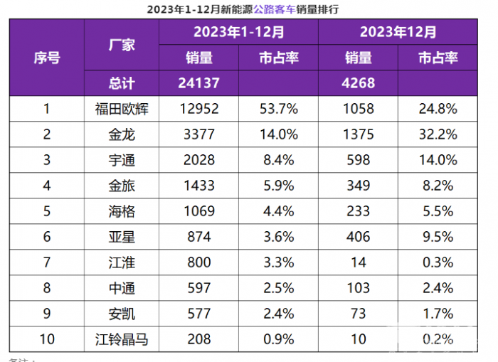截图1,2023年1-12月、12月5米以上新能源公路客车销量及占比(数据来源:慧眼看车)