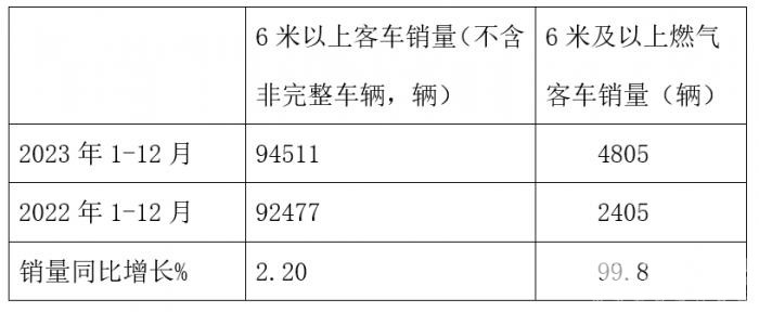 表1:2023年6米以上国六燃气客车与客车大盘同比增速比较(数据来源:终端上牌及中国客车统计信息网)