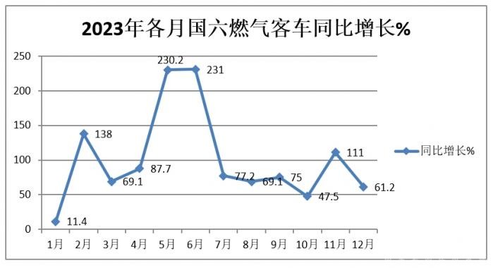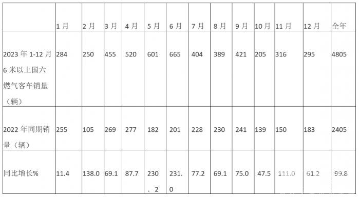 表4,根据终端上牌信息统计,2023年各月6米以上国六天然气客车销售同比增幅: