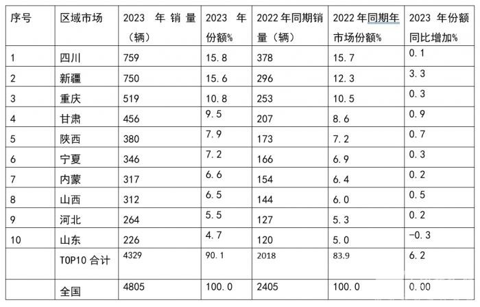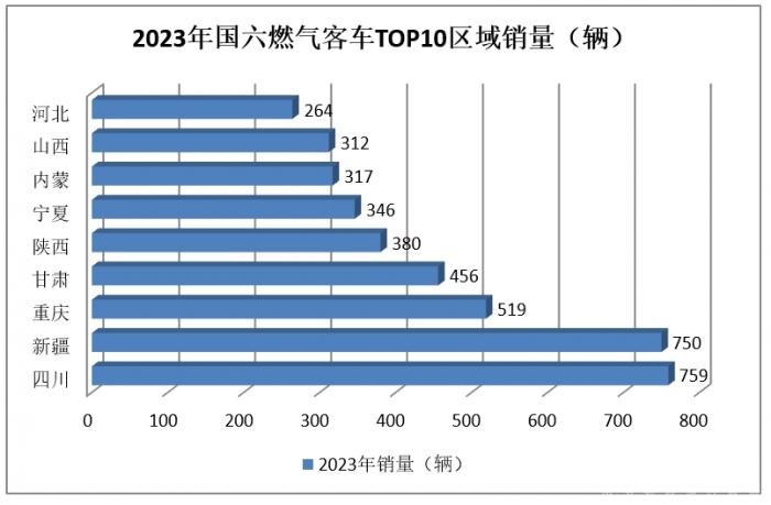根据终端上牌信息显示,2023年6米以上国六天然气客车累计销售4805辆,但在全国区域销量流向不均衡,主要销往四川、新疆、重庆、甘肃、陕西、新疆、宁夏等气源比较丰富、且加气站网点比较密的区域