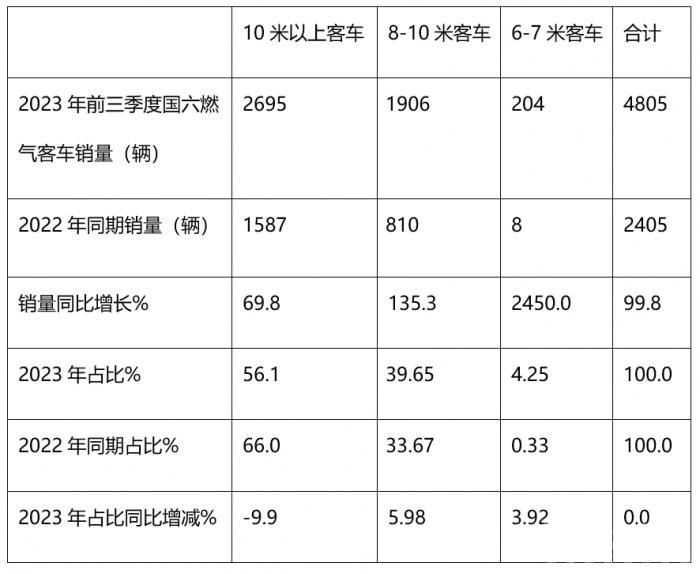 表2,根据终端上牌数据,按米段划分,2023年6米以上国六燃气类客车市场销量、同比及占比: