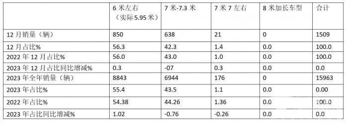 表3,根据上牌信息,2023年12月考斯特客车按长度段车型划分销量结构: