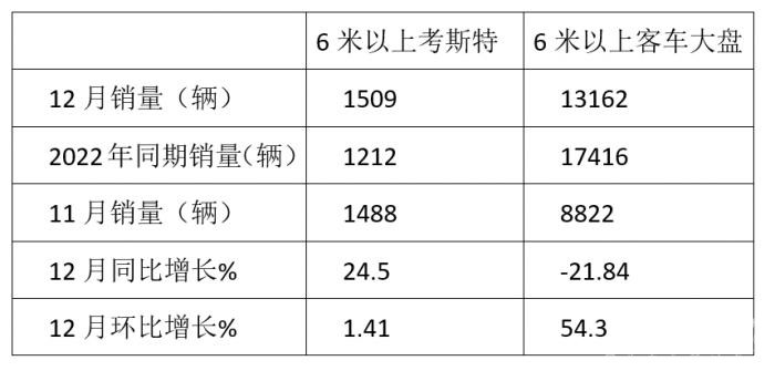 根据终端上牌及中国客车信息网数据,2023年12月6米(含,下同)以上考斯特客车销量、同比与6米以上大中型客车比较: