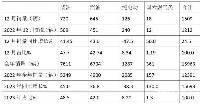 表4,根据终端上牌数据统计,按燃料种类划分,2023年12月、全年考斯特客车销量结构及同比: