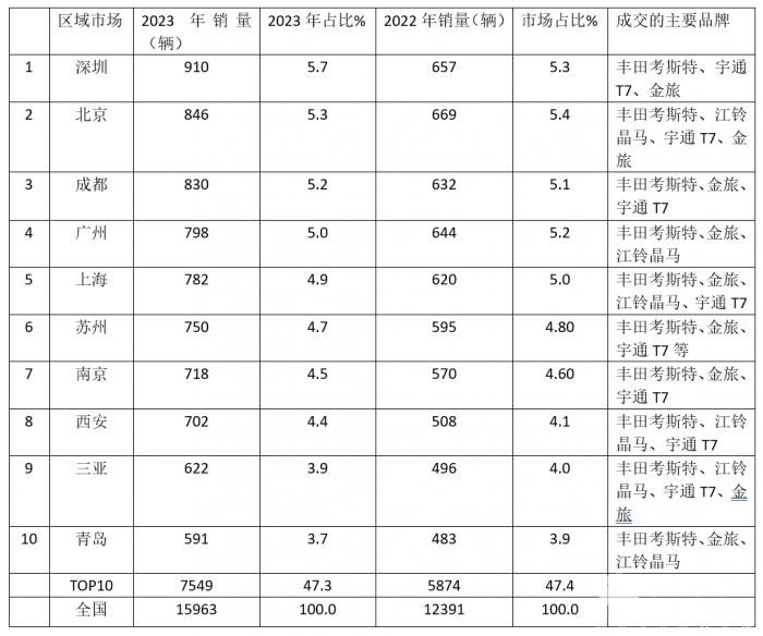 表5,根据各地上牌信息,2023年全年,考斯特客车流向前10名区域销量统计: