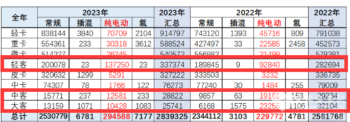 根据截图1、截图2数据,按动力种类划分,2023年三大类客车国内销量、占比及占比同比增减统计如下表: